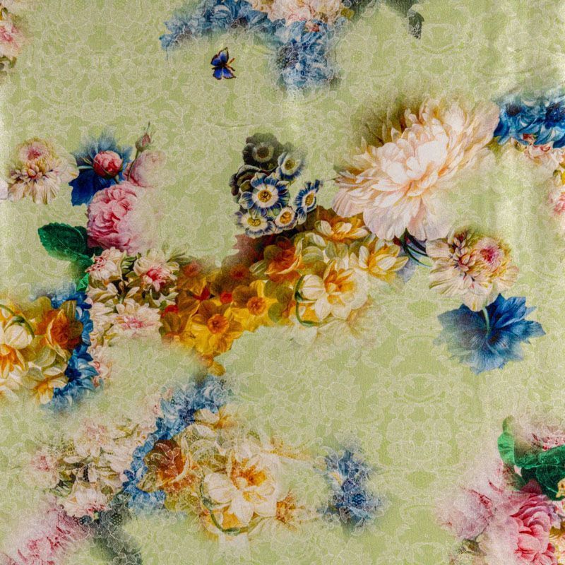 Итальянский атласный шелк с цветочным принтом на светло-салатовом фоне, имитирующем факту изысканного кружева, тонкий, слегка прозрачный, отлично драпируется,  легкий и струящийся. Идеально подойдет для пошива платьев и сарафанов расклешенных моделей, с воланами, летящих юбок, топов, блузки, костюма в пижамном стиле.
