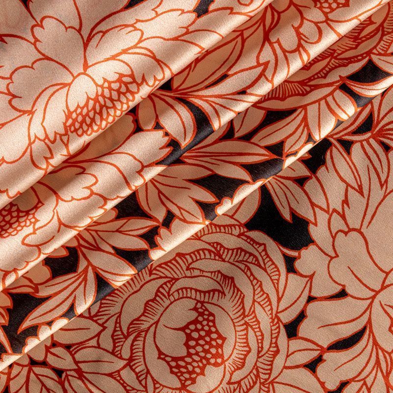 Итальянский атласный шелк с изящно прорисованными цветами в коралловых оттнках на черном фоне. Ткань тонкая, слегка просвечивает, струится, хорошо драпируется. Поверхность глядкая, имеет благородный сатиновый блеск. Подойдет смелых образов: летних платьев и сарафанов, как летящих фасонов, так и скроенных по косой, накидок, юбок, блузок, костюмов в пижамном стиле, туники, широких брюк, домашней одежды.