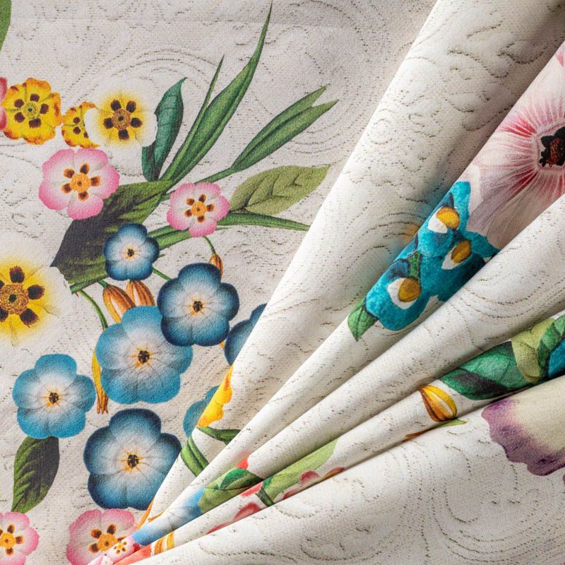 Итальянский атласный шелк с ярким цветочным принтом на фоне, имитурующем жаккардовый узор. Ткань средней плотности, не просвечивает, струится, хорошо драпируется. Поверхность гляпдкая, имеет благородный сатиновый блеск. Подойдет для летних платьев накидок, юбок, блузок, костюмов, широких брюк, домашней одежды.