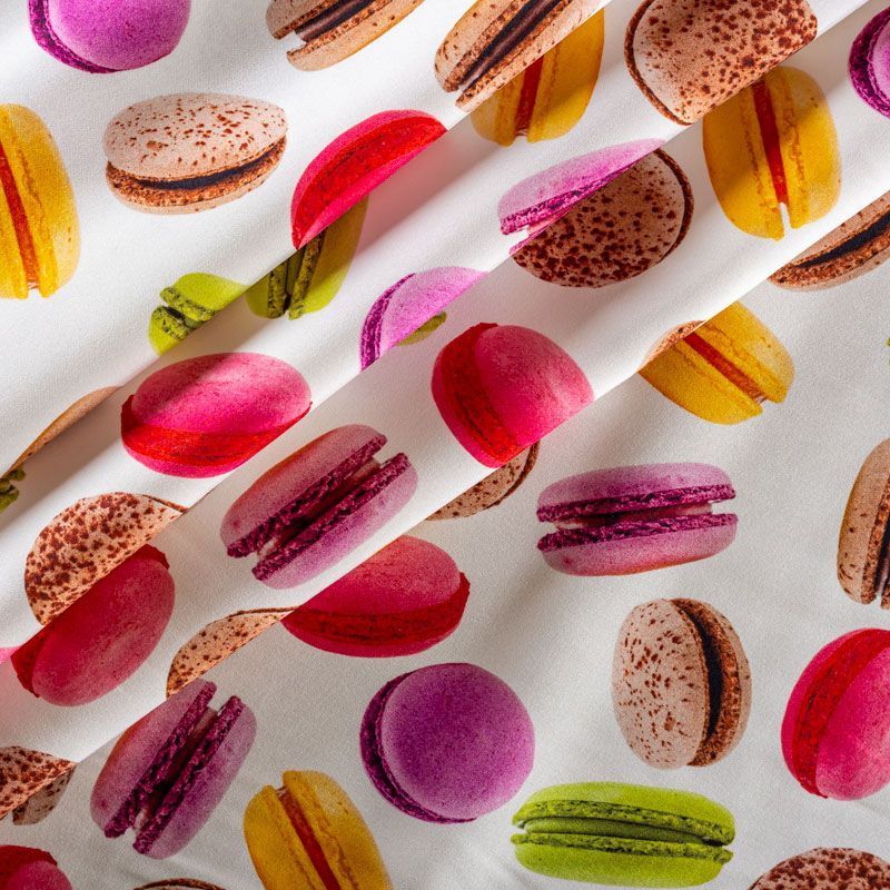 Итальянский шелк с матовой лицевой поверхностью и атласной изнанкой с "вкусным" ярким принтом на молочном фоне, тонкий, слегка прозрачный, отлично драпируется, не много тянется за счет эластана в составе, легкий и струящийся. Идеально подойдет для пошива платьев и сарафанов расклешенных моделей, с воланами, летящих юбок, топов, блузки, костюма в пижамном стиле.