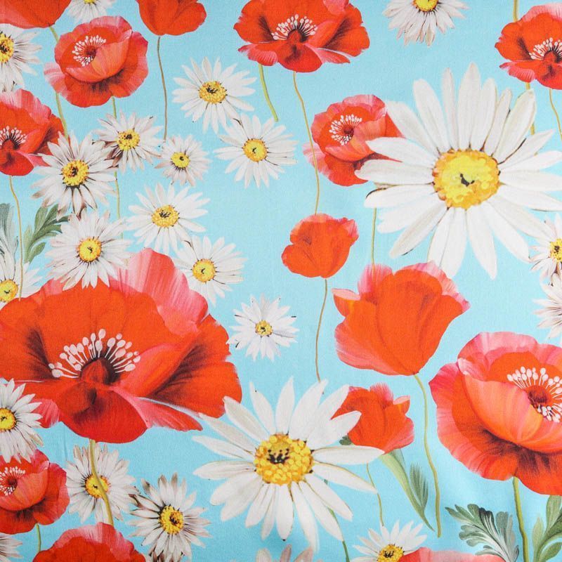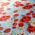 Итальянский атласный шелк, дизайн которого вдохновлен образом из коллекции известного бренда. На небесно-голубом фоне здесь - лаконичный и очень летний рисунок в виде ромашек и красных маков. Ткань средней плотности, не просвечивает, струится, хорошо драпируется. Поверхность глядкая, имеет благородный сатиновый блеск. Подойдет для летних платьев, накидок, юбок, блузок, костюмов, широких брюк, домашней одежды.