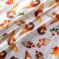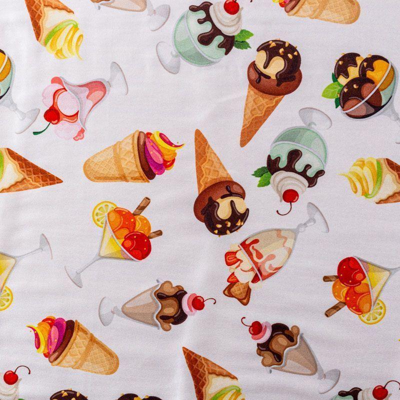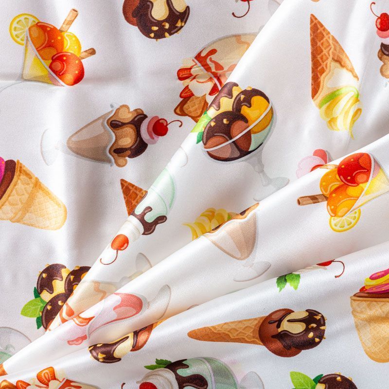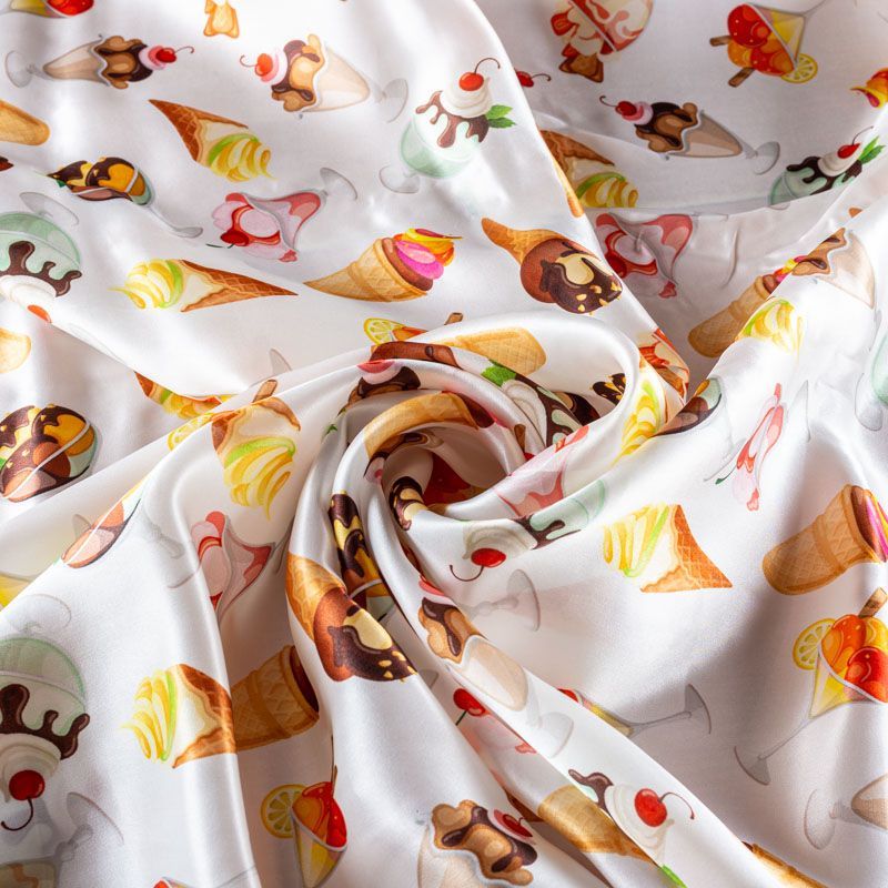 Натуральный шелк с атласной поверхностью, легкий, струящийся, хорошо драпируется. "Вкусный" принт выполнен в ярких оттенках, который будет уместен для пошива летнего сарафана, платья, блузки, костюма в пижамном стиле, широких брюк или юбки.