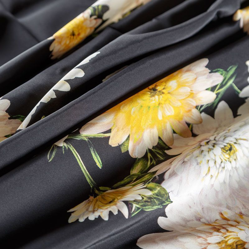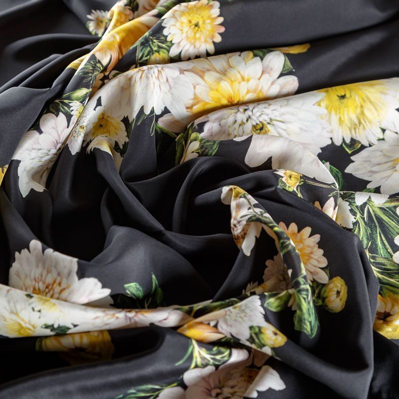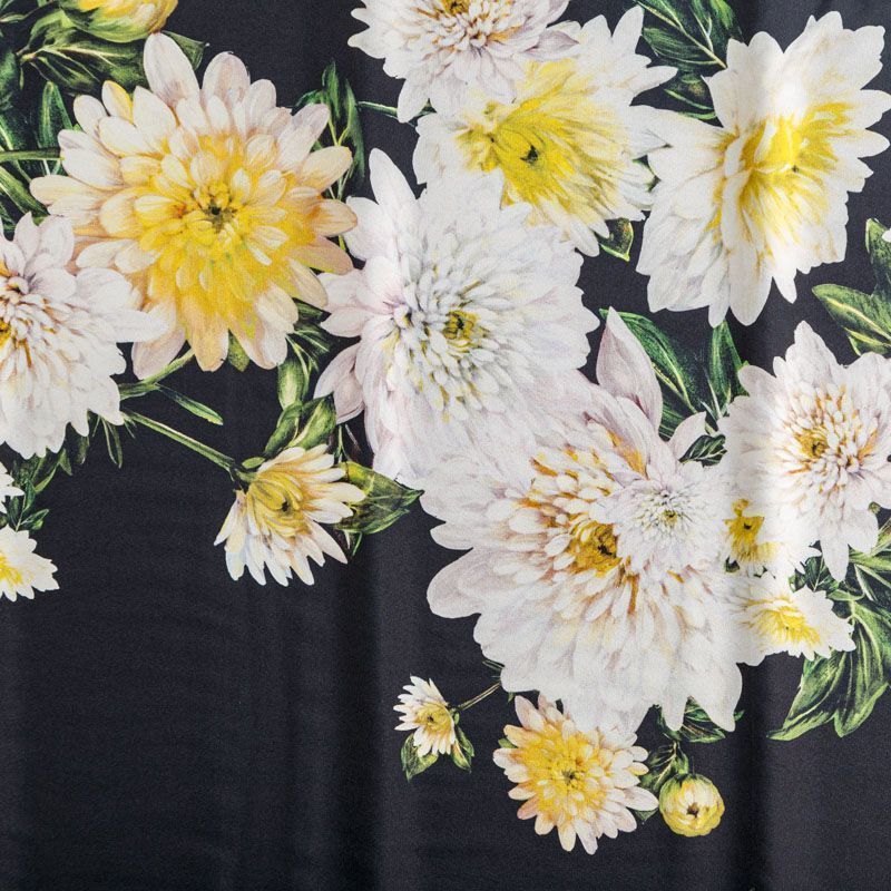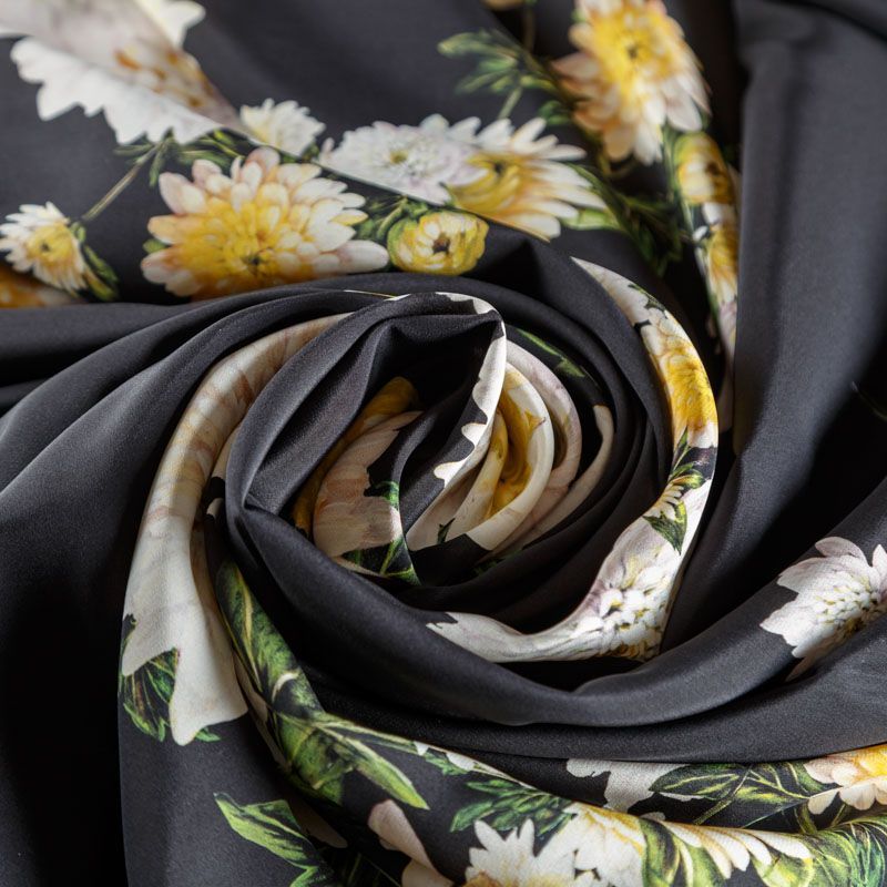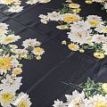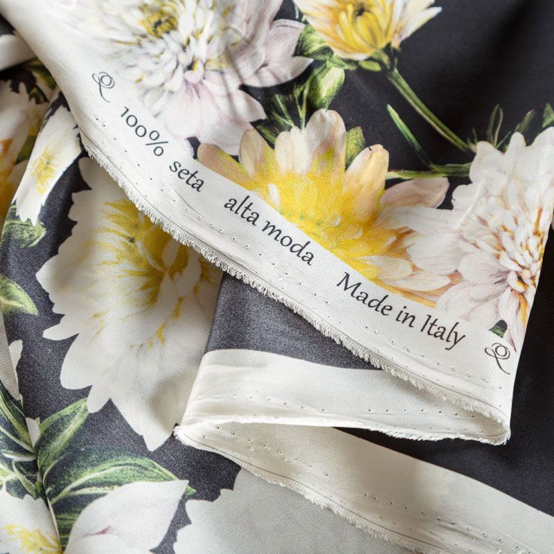 Итальянский матовый шелк с красивым крупным цветочным принтом. Ткань средней плотности, не просвечивает, струится, хорошо драпируется. Поверхность глядкая, имеет благородный сатиновый блеск. Подойдет смелых образов: летних платьев и сарафанов, как летящих фасонов, так и скроенных по косой, накидок, юбок, блузок, костюмов, широких брюк, домашней одежды.