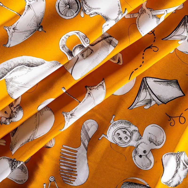 Итальянский матовый шелк благородного шафранового оттенка с узнаваемым игривым принтом от известного бренда. Ткань тонкая, не просвечивается, отлично драпируется, легкая и струящаяся, тянется за счет эластана в составе, лицевая сторона креповая, изнанка - атласная. Идеально подойдет для пошива платьев и сарафанов расклешенных моделей, с воланами, рюшами, летящих юбок, топов, блузки, рубашки, костюма в пижамном стиле.