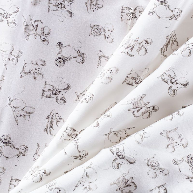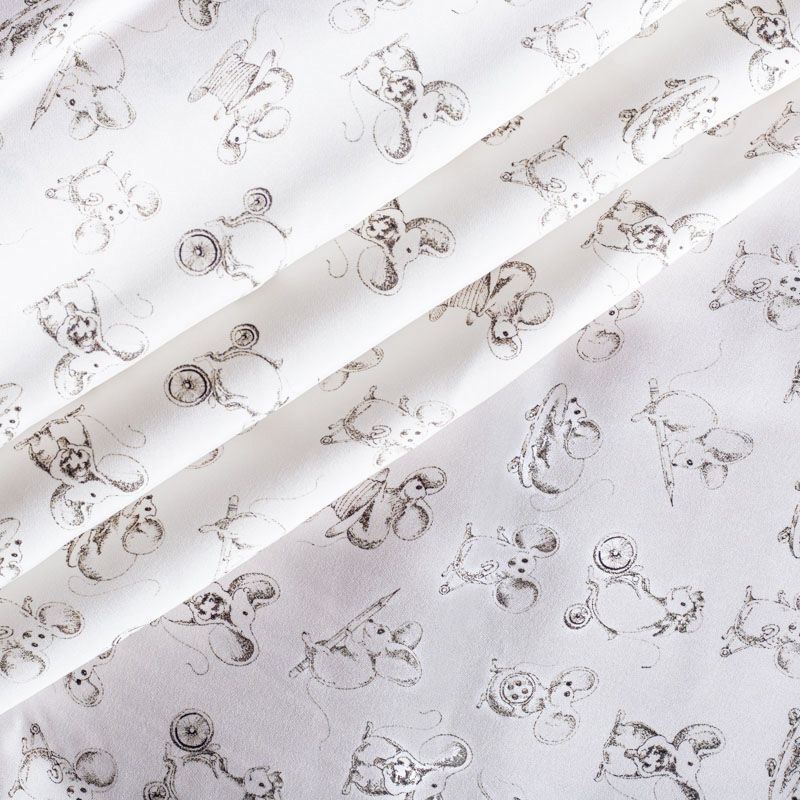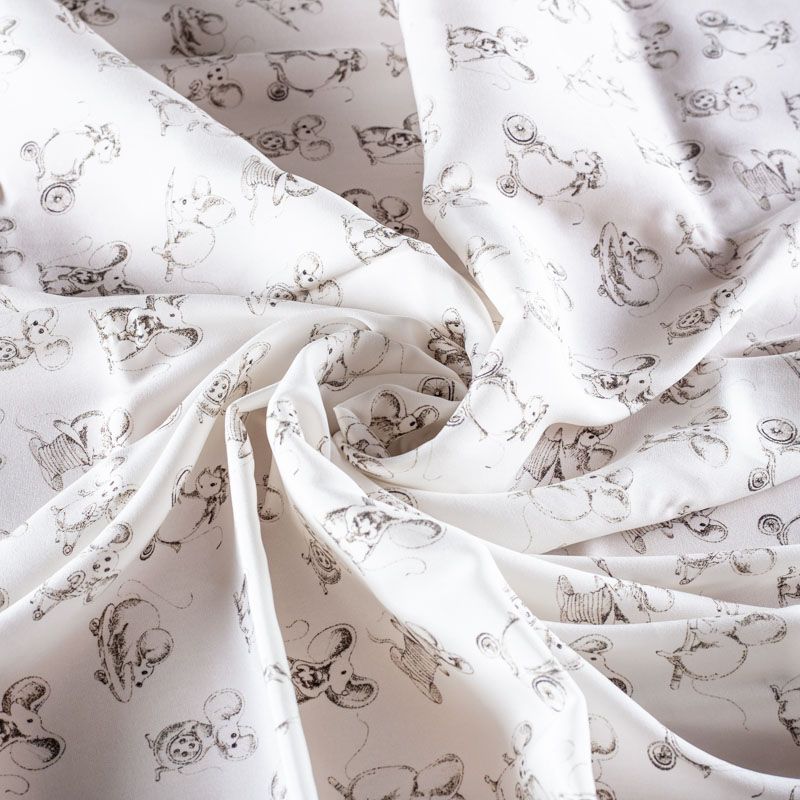Итальянский матовый шелк молочного оттенка с узнаваемым игривым принтом от известного бренда. Ткань тонкая, не просвечивается, отлично драпируется, легкая и струящаяся, тянется за счет эластана в составе, лицевая сторона креповая, изнанка - атласная. Идеально подойдет для пошива платьев и сарафанов расклешенных моделей, с воланами, рюшами, летящих юбок, топов, блузки, рубашки, костюма в пижамном стиле.