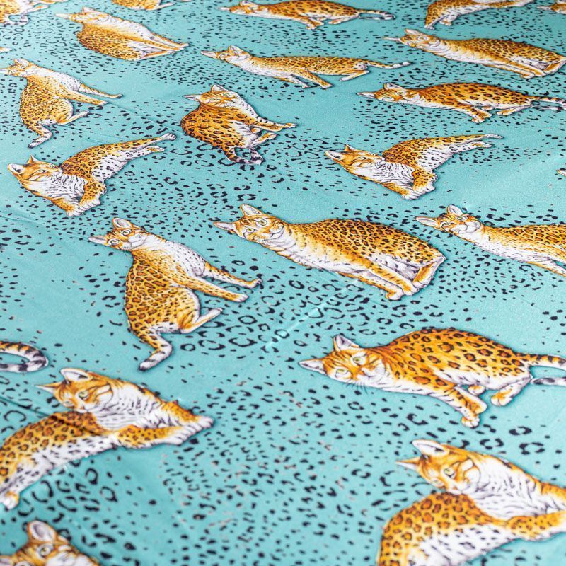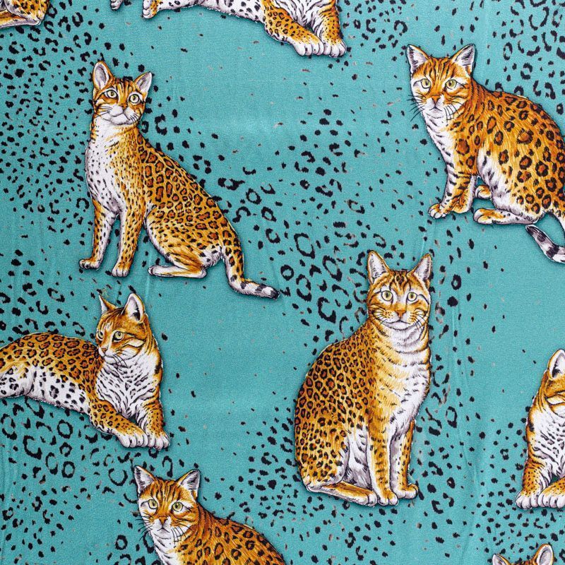 Итальянский матовый шелк бирюзового оттенка с узнаваемым принтом диких кошек от известного бренда. Ткань тонкая, не просвечивается, отлично драпируется, легкая и струящаяся, тянется за счет эластана в составе, лицевая сторона креповая, изнанка - атласная. Идеально подойдет для пошива платьев и сарафанов расклешенных моделей, с воланами, рюшами, летящих юбок, топов, блузки, рубашки, костюма в пижамном стиле.