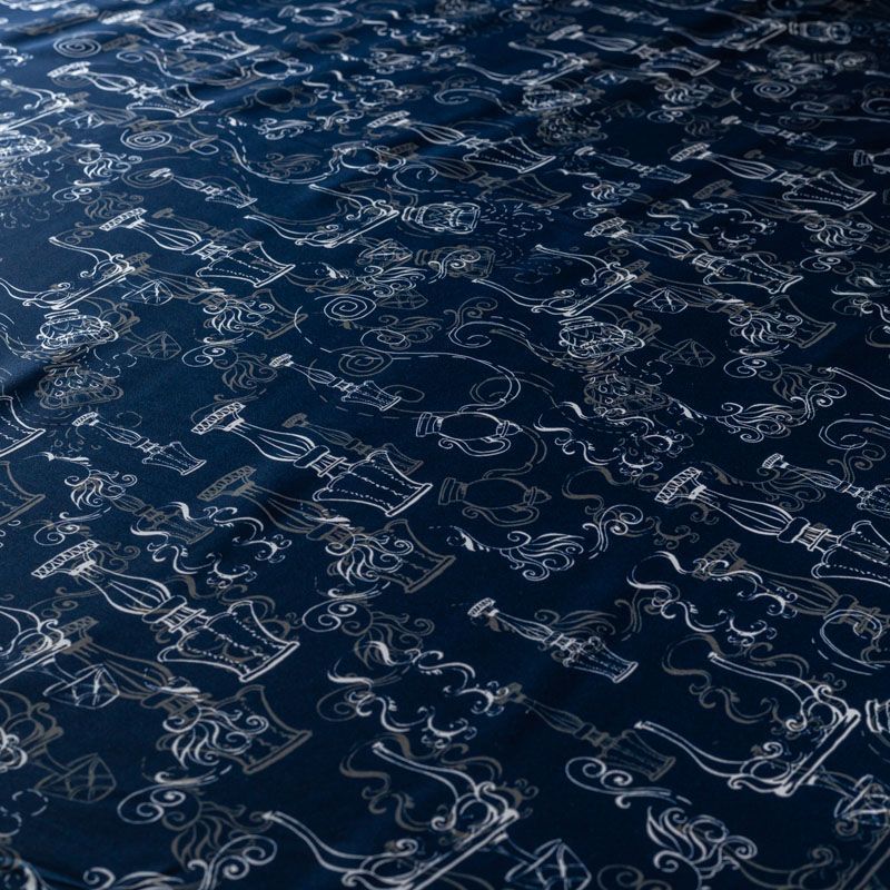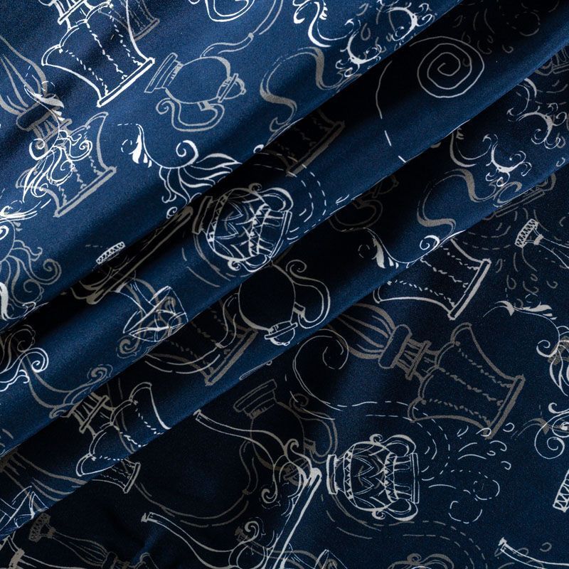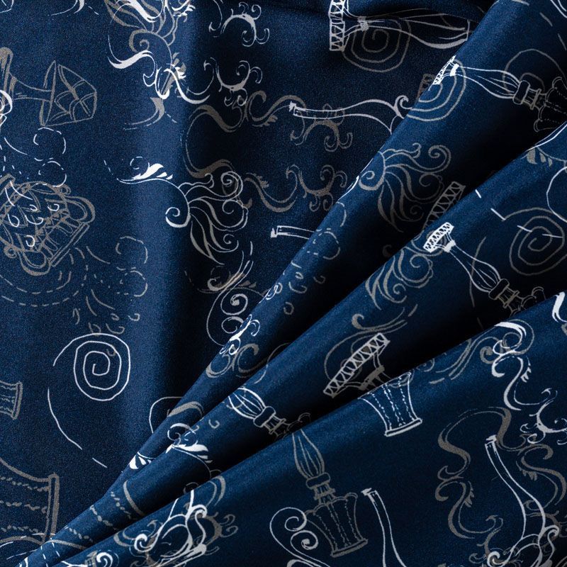 Итальянский матовый шелк насыщенного темно-синего оттенка с узнаваемым принтом. Ткань тонкая, не просвечивается, отлично драпируется, легкая и струящаяся, тянется за счет эластана в составе, лицевая сторона креповая, изнанка - атласная. Идеально подойдет для пошива платьев и сарафанов расклешенных моделей, с воланами, рюшами, летящих юбок, топов, блузки, рубашки, костюма в пижамном стиле.