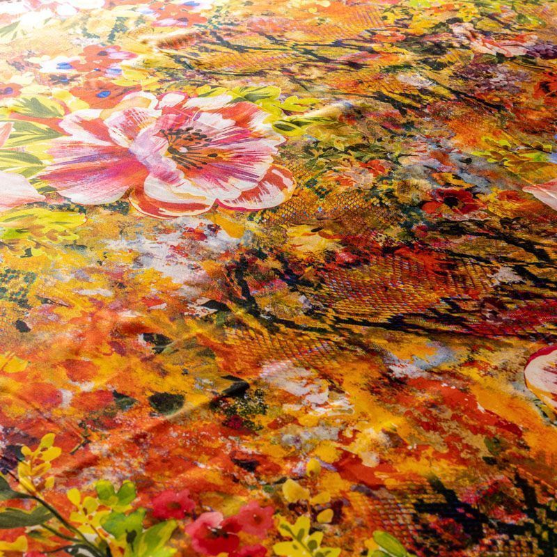 Итальянский натуральный шелк с атласной поверхностью, легкий, струящийся, хорошо драпируется, тянется за счет эластана в составе. Сочетание актуальных в текущем сезоне цветочного и анималистического принтов в насыщенных оттенках будет уместно для пошива летнего сарафана, платья, блузки, костюма в пижамном стиле, широких брюк или юбки.
