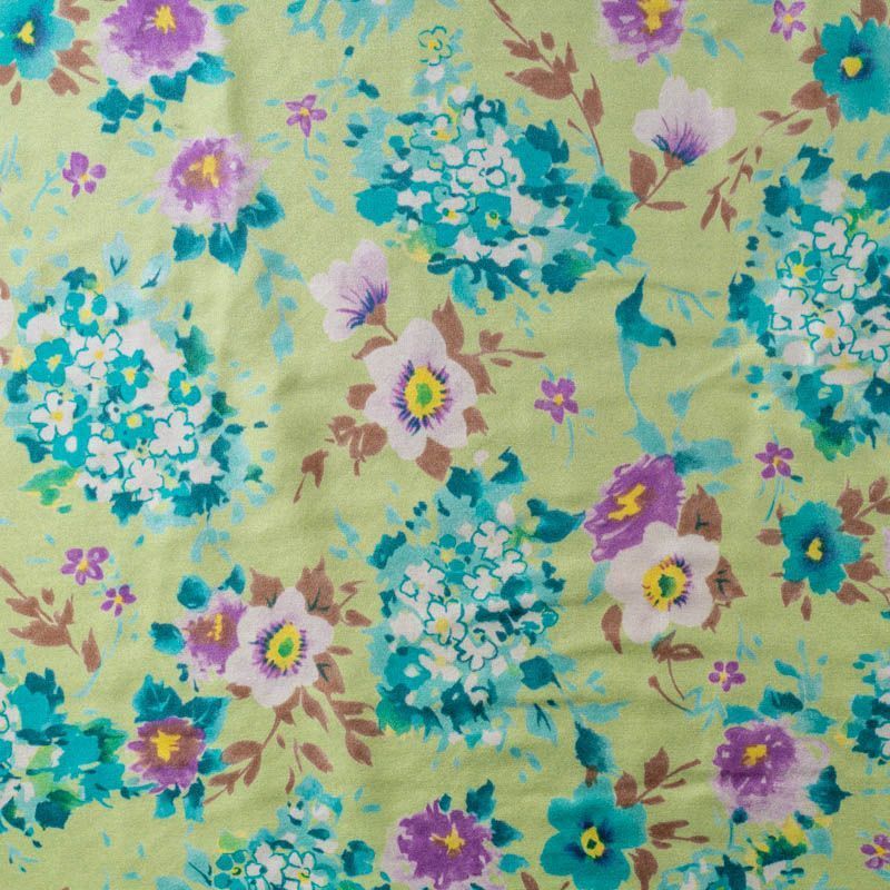 Итальянский атласный шелк с красивым акварельным цветочным принтом на освежающем мятном фоне. Ткань средней плотности, не просвечивает, струится, хорошо драпируется. Поверхность глядкая, имеет благородный сатиновый блеск. Подойдет для летних платьев, накидок, юбок, блузок, костюмов, широких брюк, домашней одежды.