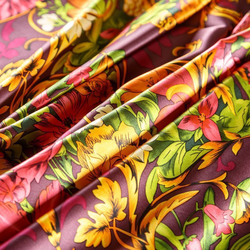 Итальянский атласный шелк с красивым принтом. Ткань средней плотности, не просвечивает, струится, хорошо драпируется. Поверхность глядкая, имеет благородный сатиновый блеск. Подойдет смелых образов: летних платьев и сарафанов, как летящих фасонов, так и скроенных по косой, накидок, юбок, блузок, костюмов, широких брюк, домашней одежды.