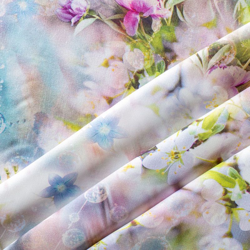Плательно-блузочный штапель с добавлением шелка с флористическим принтом. Ткань очень мягкая, нежная, пластичная, шелковистая на ощупь, хорошо драпируется, практичная. Особенно актуальна летом, шелк-штапель очень легкий, обволакивающий прохладой. Идеален для пошива летней детской одежды, сарафанов, платьев, юбок, блузок, домашней одежды: халатов, ночной пижамы.