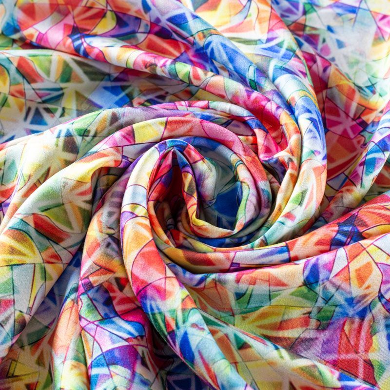 Плательно-блузочный штапель с добавлением шелка с ярким геометрическим принтом. Ткань очень мягкая, нежная, пластичная, шелковистая на ощупь, хорошо драпируется, практичная. Особенно актуальна летом, шелк-штапель очень легкий, обволакивающий прохладой. Идеален для пошива летней детской одежды, сарафанов, платьев, юбок, блузок, домашней одежды: халатов, ночной пижамы.