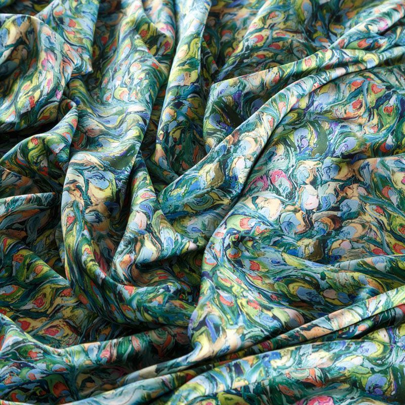 Плательно-блузочный штапель с добавлением шелка зеленого оттенка с цветным абстрактным акварельным принтом. Мягкий, нежный, пластичный, шелковистый на ощупь, хорошо драпируется, практичный. Особенно актуален летом, он очень легкий, обволакивающий прохладой. Идеален для пошива летней детской одежды, сарафанов, платьев, юбок, блузок, домашней одежды: халатов, ночной пижамы.