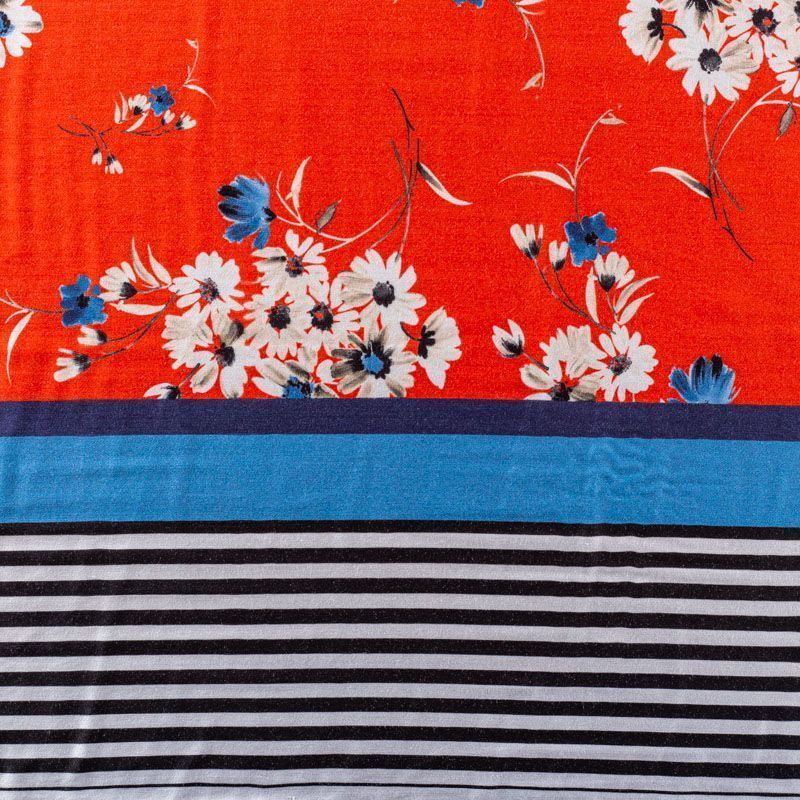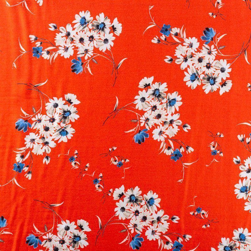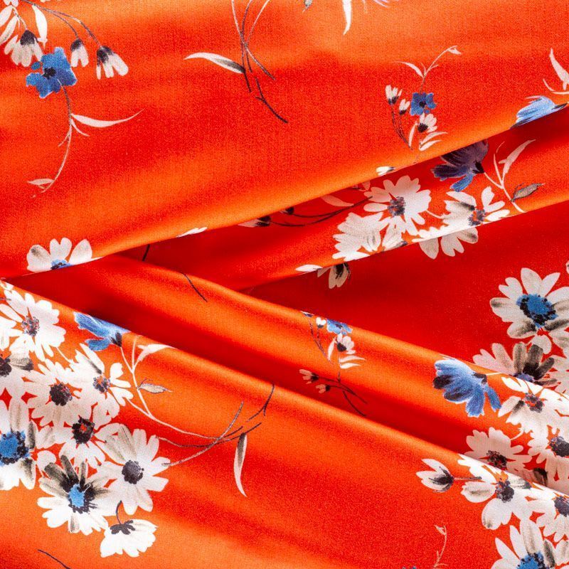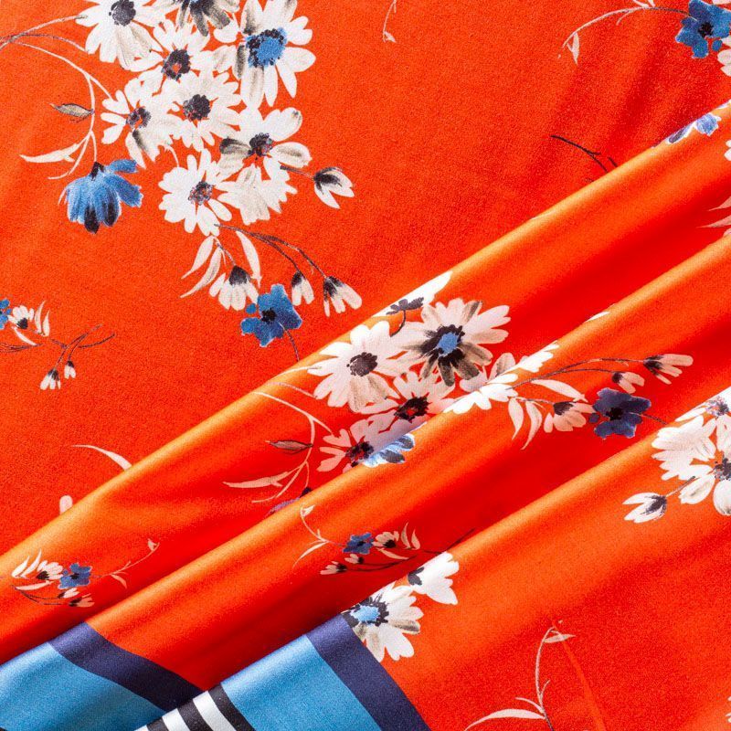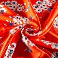 Итальянский плательно-блузочный штапель с добавлением шелка красно-оранжевого оттенка с цветочным принтом и декоративным кантом вдоль кромки. Мягкий, нежный, пластичный, шелковистый на ощупь, хорошо драпируется, практичный. Особенно актуален летом, он очень легкий, обволакивающий прохладой. Идеален для пошива летней детской одежды, сарафанов, платьев, юбок, блузок, домашней одежды: халатов, ночной пижамы.