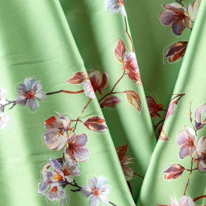 Тонкая, легкая, струящаяся ткань, не просвечивает, очень нежная и прятная к телу, обладает благородным атласным блеском, хорошо драпируется, тянется за счет эластана в составе. Идеально подойдет для пошива блузок, платьев и юбок, а также топов, платков, домашней одежды.