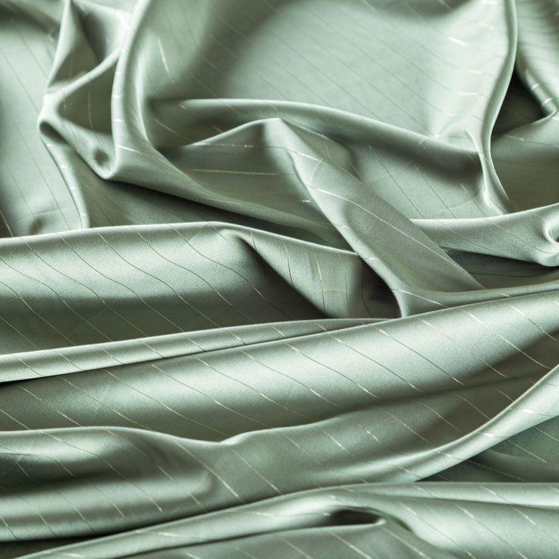 Тонкая, легкая, струящаяся ткань, декорированная тонкими вертикальными полосками люресовой нити, не просвечивает, очень нежная и прятная к телу, обладает благородным атласным блеском, хорошо драпируется, тянется за счет эластана в составе. Идеально подойдет для пошива блузок, платьев и юбок, а также топов, платков, домашней одежды.