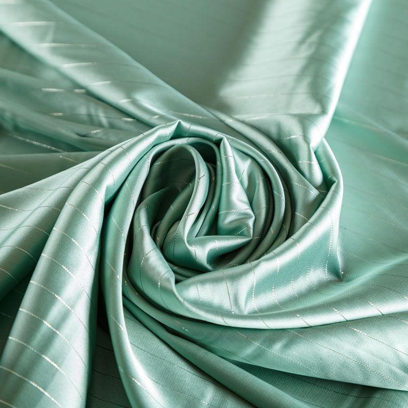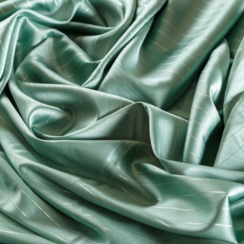 Тонкая, легкая, струящаяся ткань, декорированная тонкими вертикальными полосками люресовой нити, не просвечивает, очень нежная и прятная к телу, обладает благородным атласным блеском, хорошо драпируется, тянется за счет эластана в составе. Идеально подойдет для пошива блузок, платьев и юбок, а также топов, платков, домашней одежды.