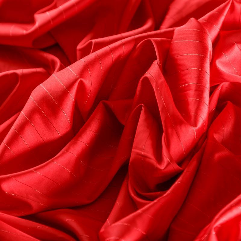 Тонкая, легкая, струящаяся ткань, декорированная тонкими вертикальными полосками люресовой нити, не просвечивает, очень нежная и прятная к телу, обладает благородным атласным блеском, хорошо драпируется, тянется за счет эластана в составе. Идеально подойдет для пошива блузок, платьев и юбок, а также топов, платков, домашней одежды.