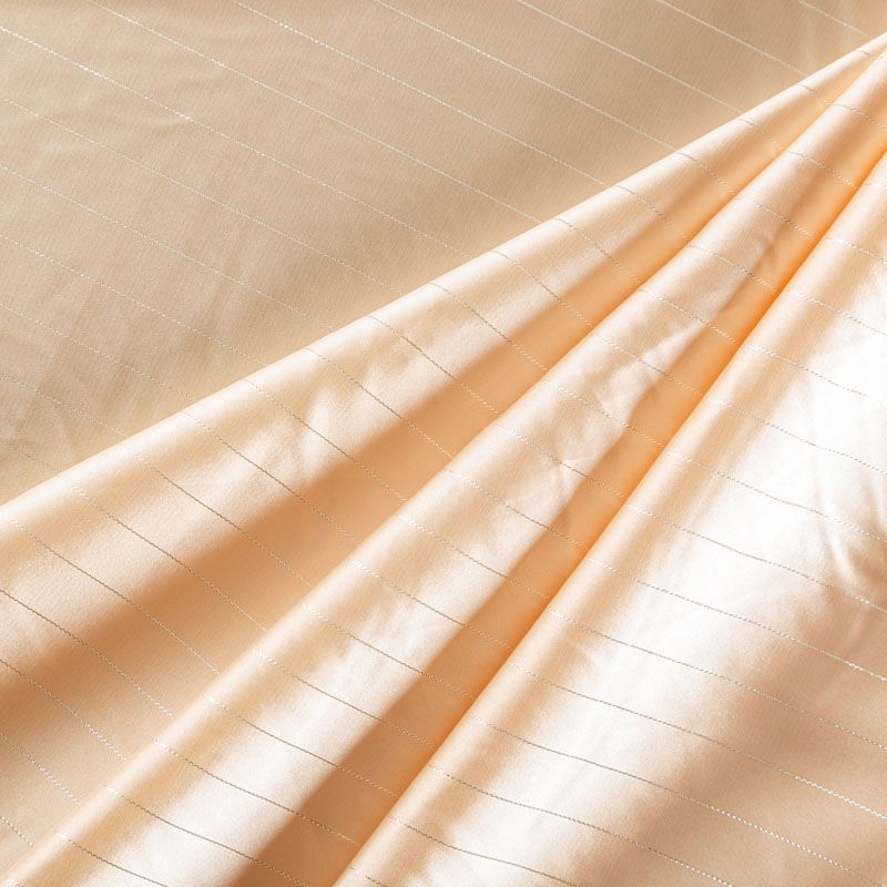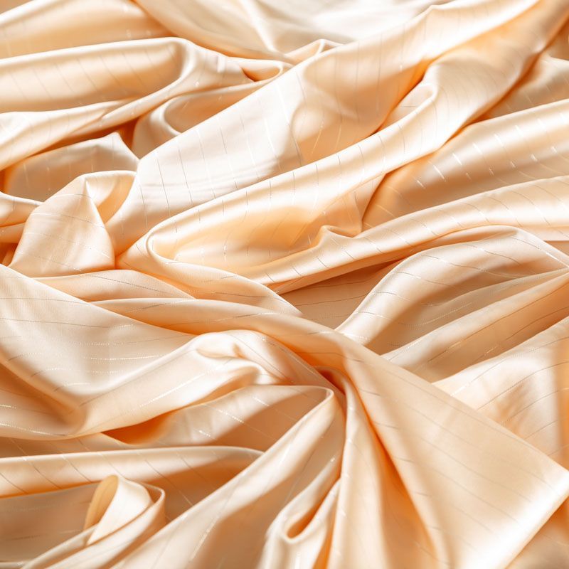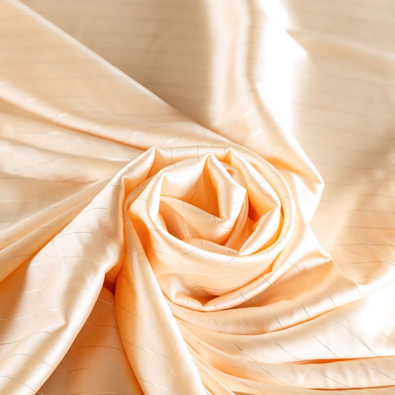 Тонкая, легкая, струящаяся ткань, декорированная тонкими вертикальными полосками люресовой нити, не просвечивает, очень нежная и прятная к телу, обладает благородным атласным блеском, хорошо драпируется, тянется за счет эластана в составе. Идеально подойдет для пошива блузок, платьев и юбок, а также топов, платков, домашней одежды.