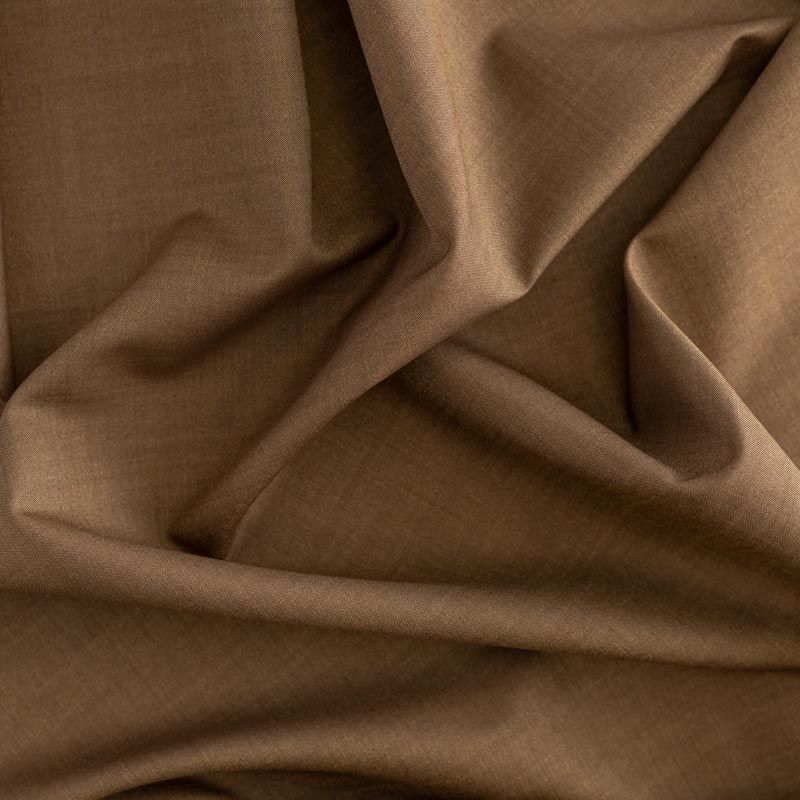 Тонкая шерсть c добавлением шелка, мягкая, уютного цвета корицы. Ткань средней плотности, имеет однородную слегка шелковистую на ощупь поверхность, легкая, «прохладная», тянется благодаря эластану в составе. Идеально подойдет для костюмов с юбками и брюками, платьев на каждый день.