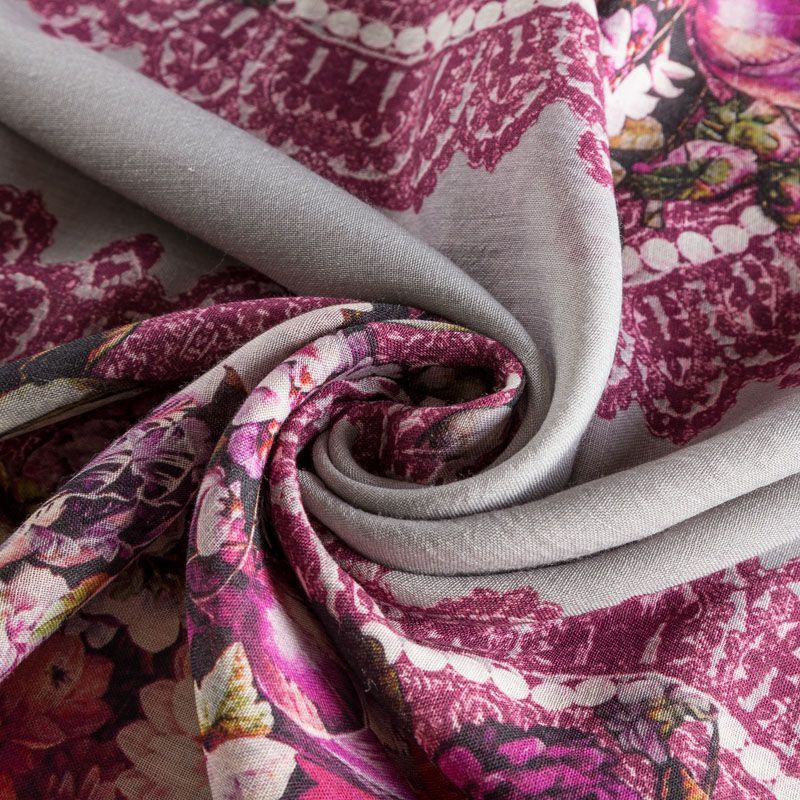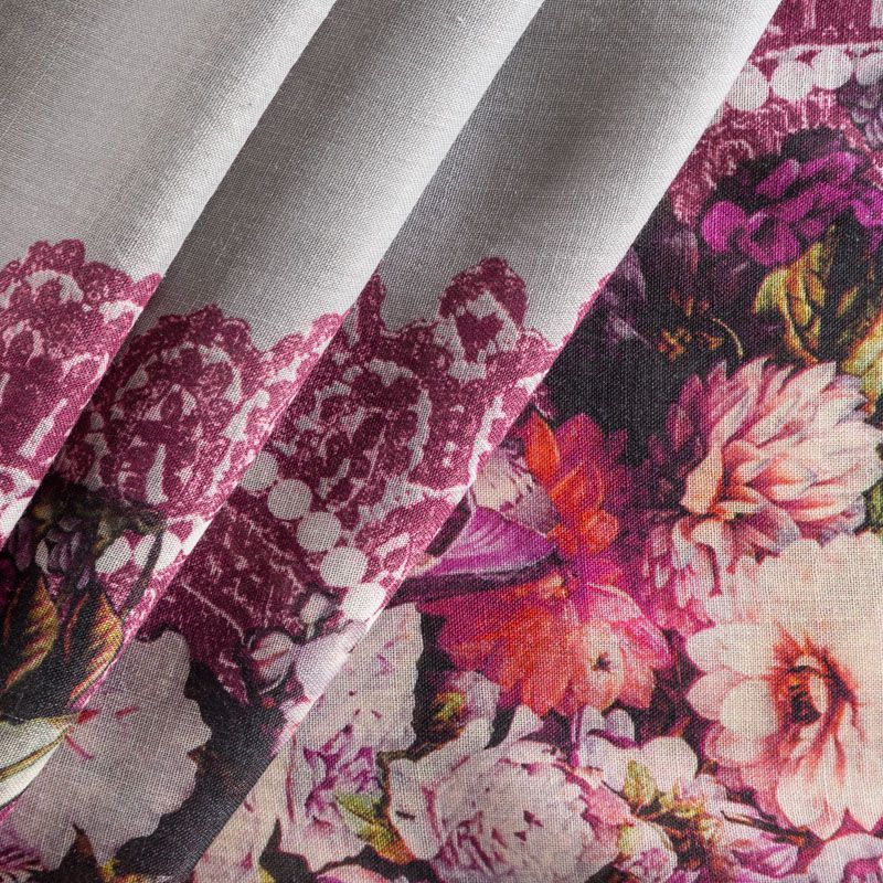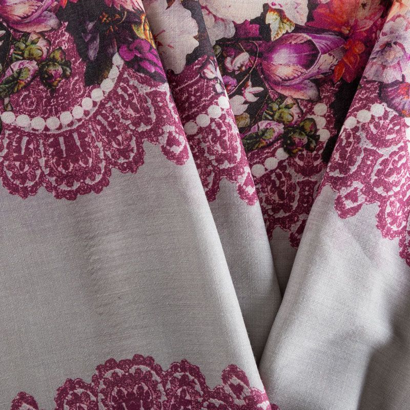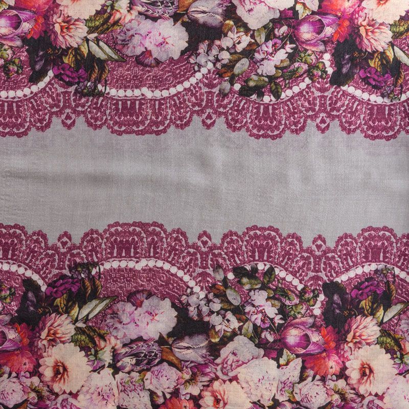 Итальянская плательная шерсть серого цвета с цветочно-кружевным принтом, расположенном вдоль линии кромки в виде полос. Ткань тонкая, мягкая и пластичная, отлично драпируется, тянется за счет эластана в составе. Поверхность матовая с полотняным плетением нитей. Прекрасно подойдет для создания осенних платьев, теплых туник, юбок, кофточек, а также аксессуаров, таких как палантины, шарфы, платки.