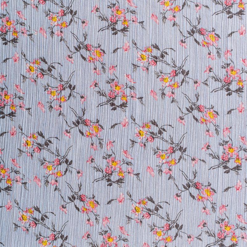 Шифон-жатка голубого оттенка с мелким цветочным принтом. Струящийся, летящий, воздушный, полупрозрачный. На ощупь мягкий и приятный. Подойдет для пошива тончайших воздушных блуз, изумительных платьев со сборками и воланами и элегантных шарфов.
