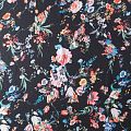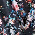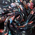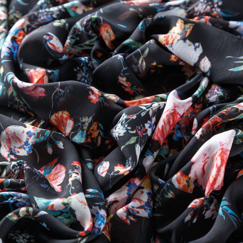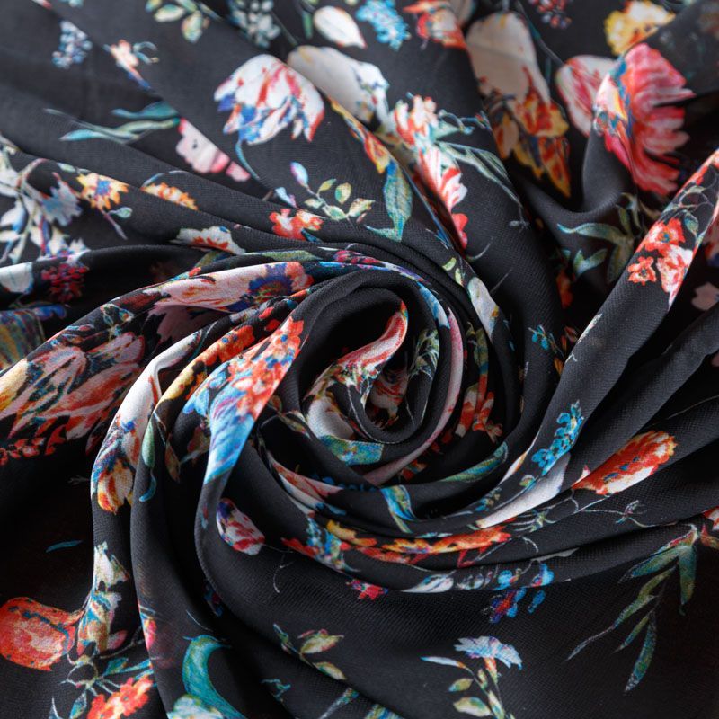 Шифон черного оттенка с ярким цвеочным принтом. Струящийся, летящий, воздушный, полупрозрачный. На ощупь мягкий и приятный.Подойдет для пошива тончайших воздушных блуз, изумительных платьев со сборками и воланами и элегантных шарфов.