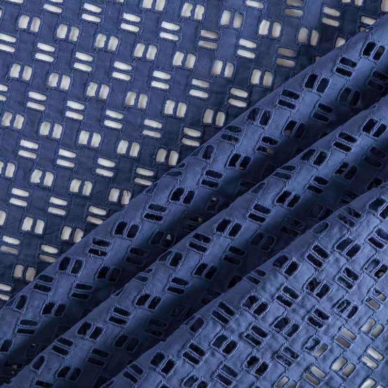 Мягкий и нежный хлопок фиолетово-синего оттенка с геометрической вышивкой и перфорацией. Узор выполнен путём машинной вышивки нитками в цвет ткани и расположен по всему полотну. Фактура ткани однородная, имеет тенденцию к сминаемости, не тянется, приятная на ощупь. Может потребоваться подклад. Идеально подходит для создания летних платьев, сарафанов, юбок, блузок и топов.