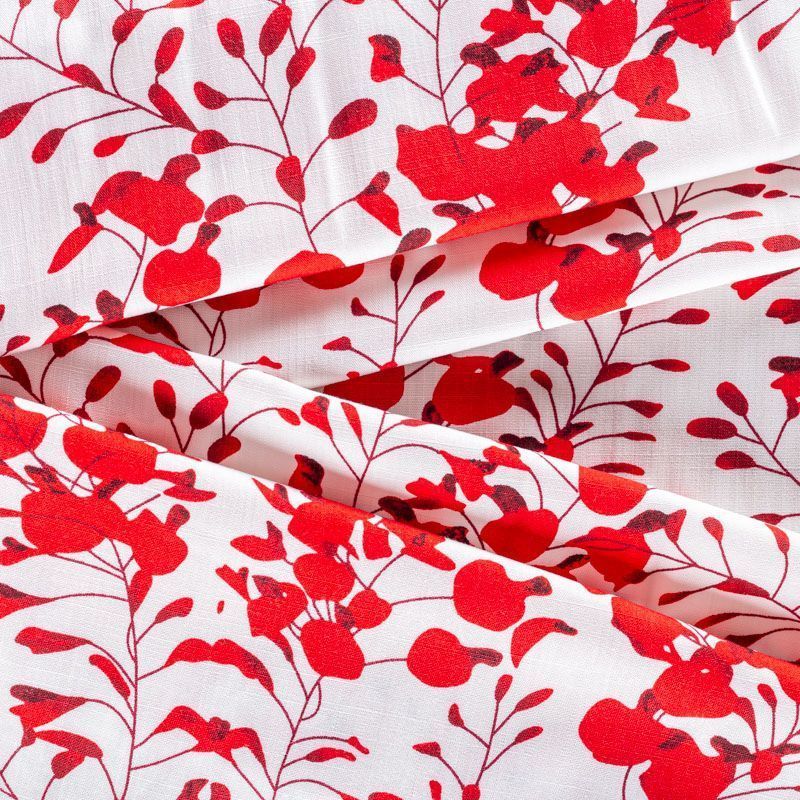 Плательно-блузочный штапель с фантазийным цветочным принтом в красных оттенках на белом фоне. Ткань мягкая, тонкая, нежная, пластичная, приятная на ощупь, хорошо драпируется, практичная, поверхность слегка фактурная. Подойдет для пошива платья, топа, блузки, рубашки, юбки, летних брюк.