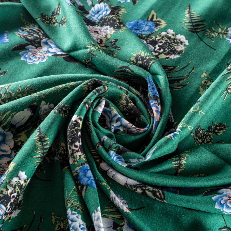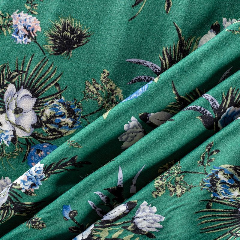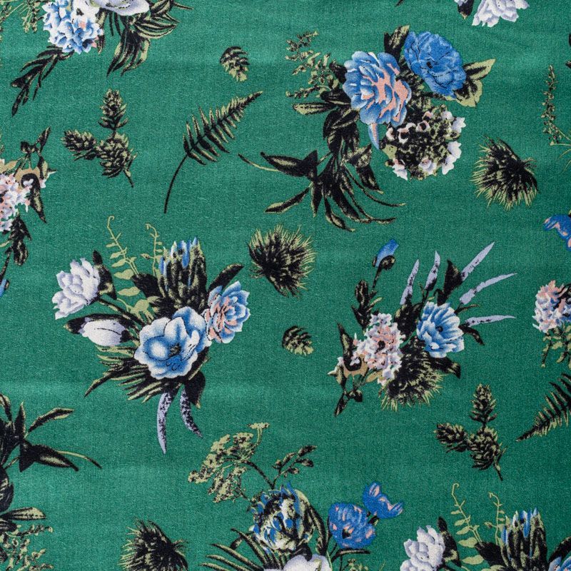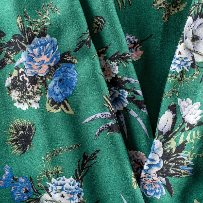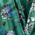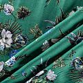 Плательно-блузочный штапель с цветочным принтом на зеленом фоне холодного оттенка. Мягкий, тонкий, нежный, пластичный, приятный на ощупь, хорошо драпируется, практичный. Подойдет для пошива платья, топа, блузки, рубашки, юбки, летних брюк.