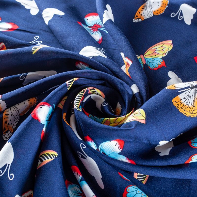 Плательно-блузочный штапель с романтичным принтом в виде цветных стилизованных бабочек на темно-синем фоне. Мягкий, тонкий, нежный, пластичный, приятный на ощупь, хорошо драпируется, практичный. Подойдет для пошива платья, топа, блузки, рубашки, юбки, летних брюк.