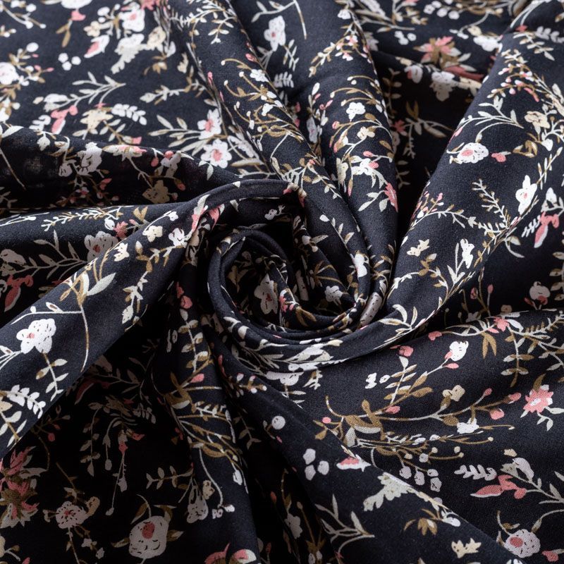 Плательно-блузочный штапель с цветочным принтом на черном фоне. Мягкий, тонкий, нежный, пластичный, приятный на ощупь, хорошо драпируется, практичный. Подойдет для пошива платья, топа, блузки, рубашки, юбки, летних брюк.
