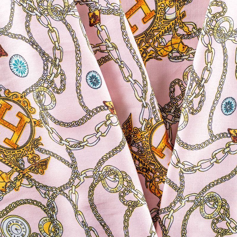 Плательно-блузочный штапель розового оттенка с многочисленными золотыми цепями, часами и украшениями. Ткань мягкая, тонкая, нежная, пластичная, приятная на ощупь, хорошо драпируется, практичная, поверхность слегка фактурная. Подойдет для пошива платья, топа, блузки, рубашки, юбки, летних брюк.