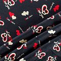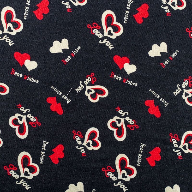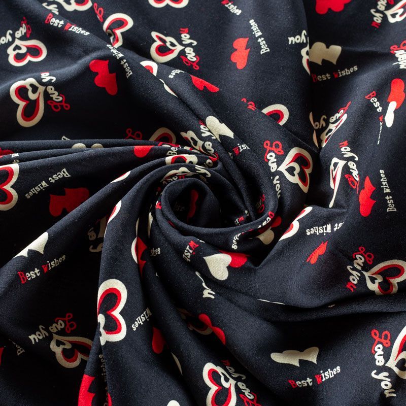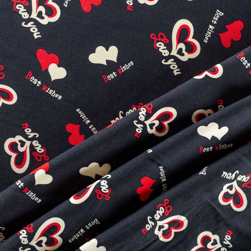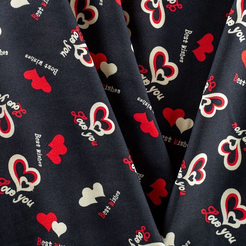 Плательно-блузочный штапель черного оттенка с многочисленными сердечками и романтическими надписями. Ткань мягкая, тонкая, нежная, пластичная, приятная на ощупь, хорошо драпируется, практичная, поверхность слегка фактурная. Подойдет для пошива платья, топа, блузки, рубашки, юбки, летних брюк.