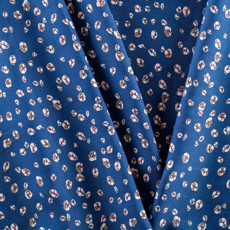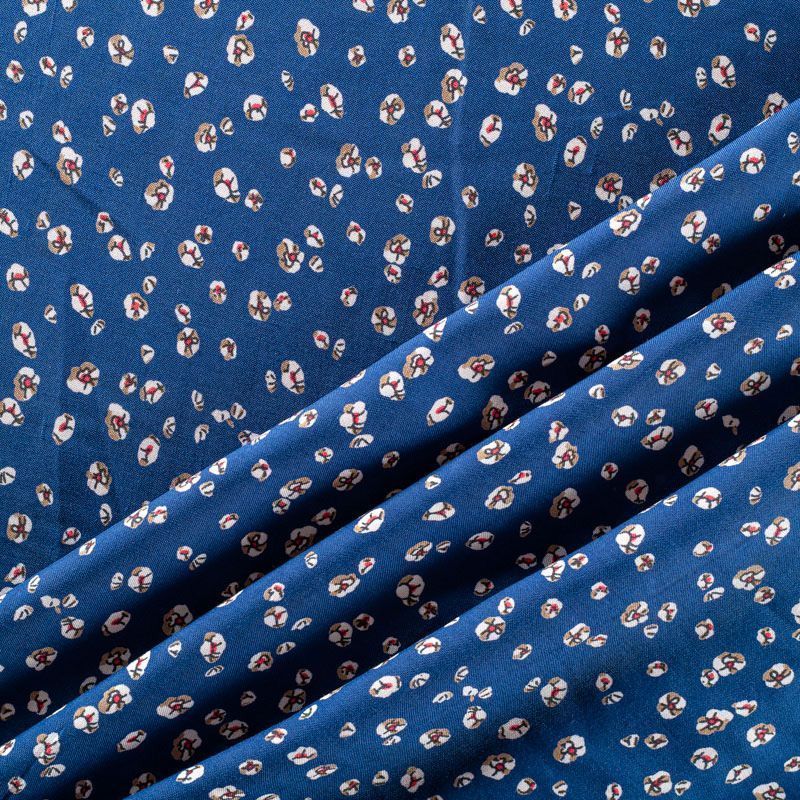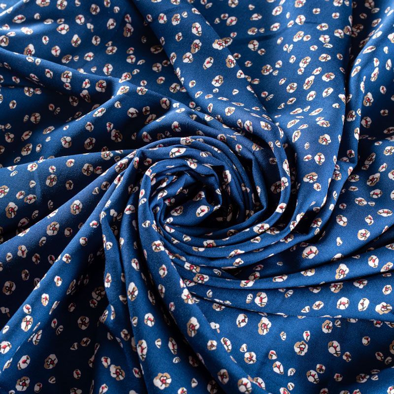 Плательно-блузочный штапель с мелким цветочным принтом на синем фоне. Мягкий, тонкий, нежный, пластичный, приятный на ощупь, хорошо драпируется, практичный. Подойдет для пошива платья, топа, блузки, рубашки, юбки, летних брюк.