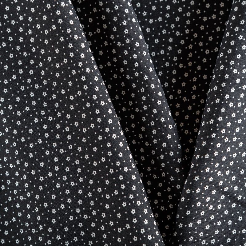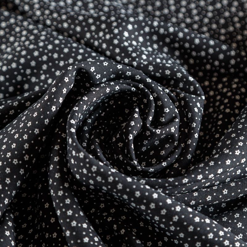 Плательно-блузочный штапель с мелким цветочным принтом на черном фоне. Материал мягкий, тонкий, нежный, пластичный, приятный на ощупь, хорошо драпируется, практичный. Подойдет для пошива платья сарафана, топа, блузки, рубашки, юбки, летних брюк, комбинезона, а также домашней одежды.