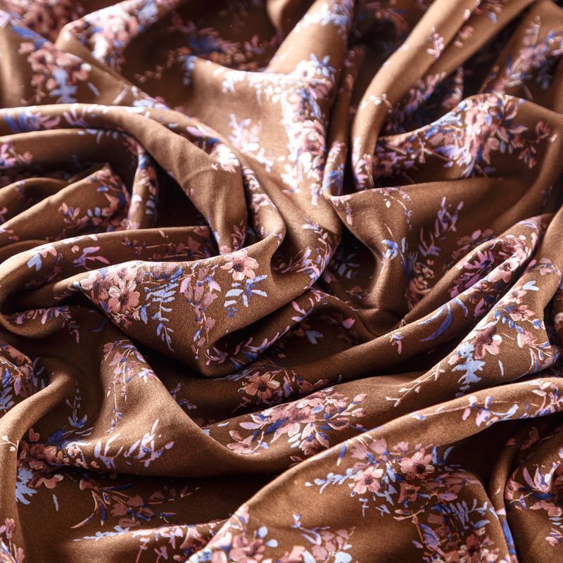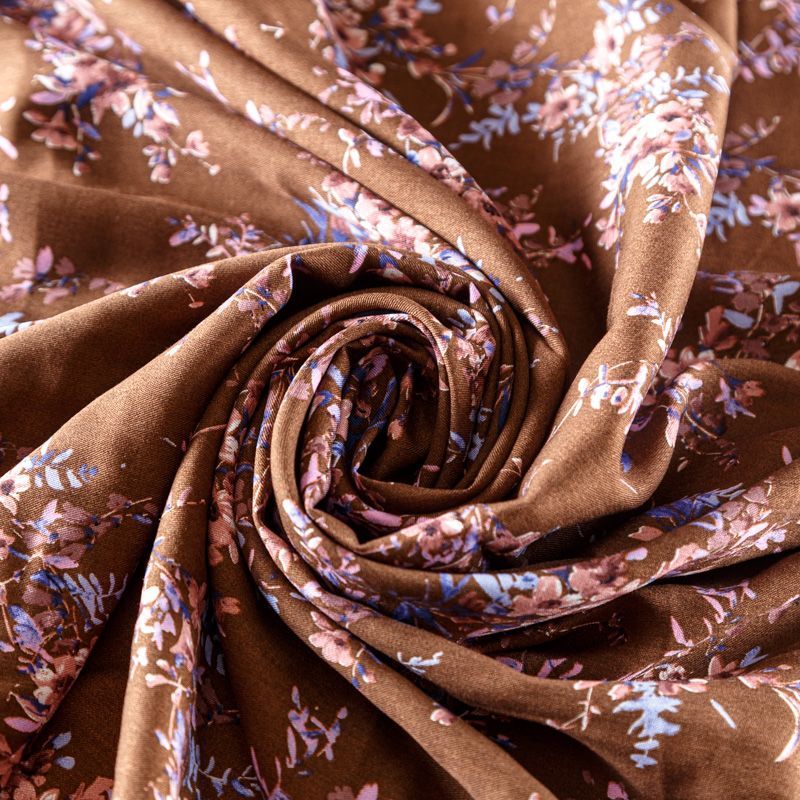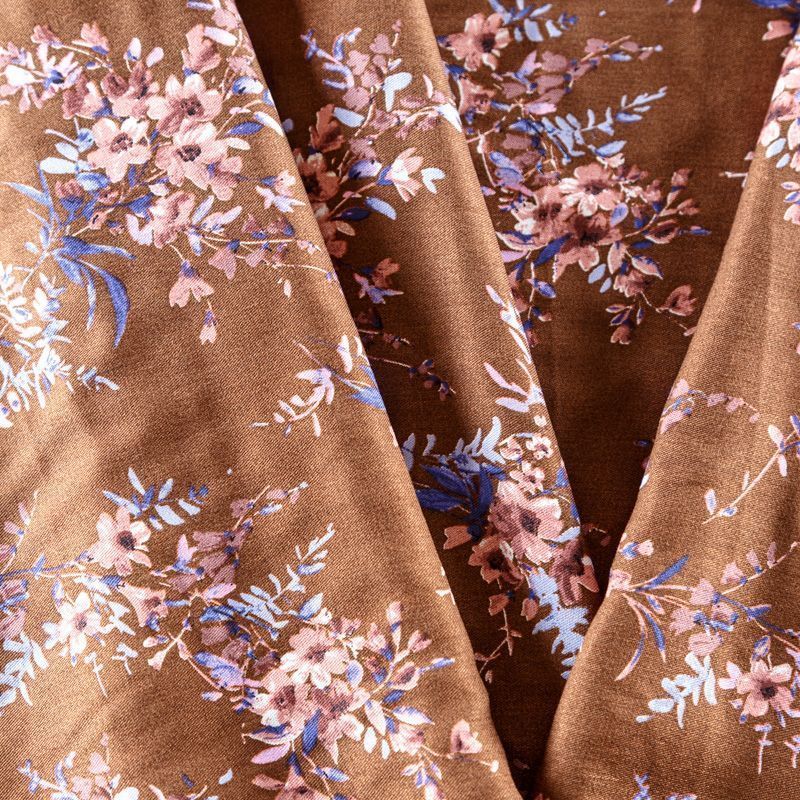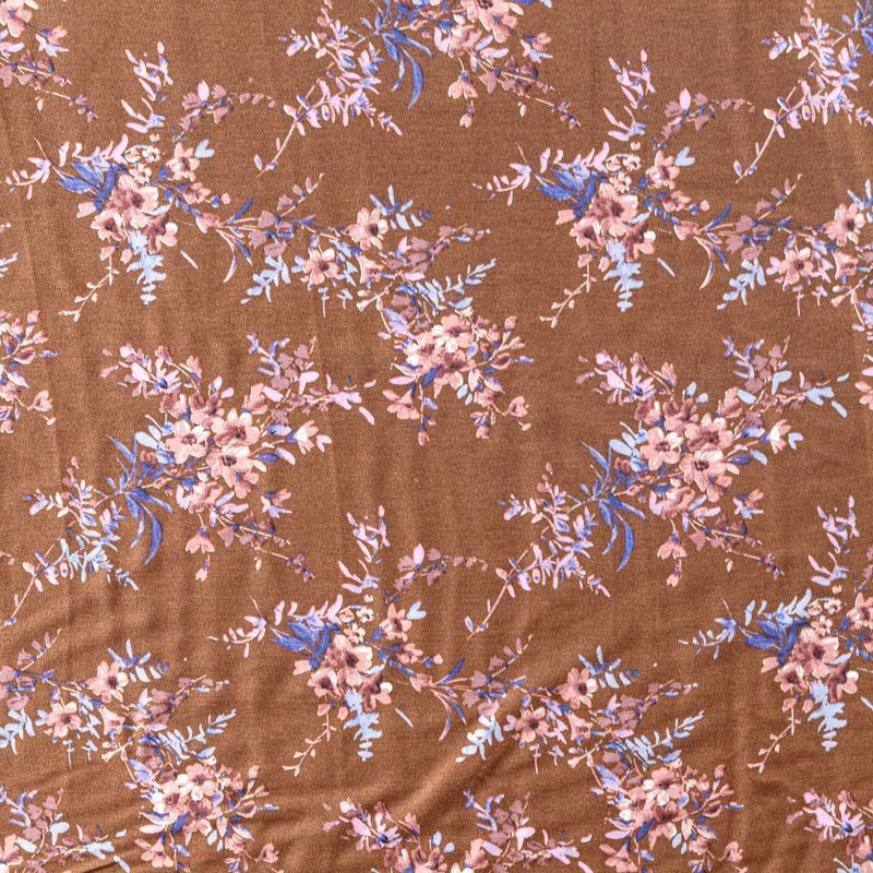 Плательно-блузочный штапель с цветочным принтом на фоне цвета корицы. Мягкий, тонкий, нежный, пластичный, приятный на ощупь, хорошо драпируется, практичный. Подойдет для пошива платья, топа, блузки, рубашки, юбки, летних брюк, комбинезона, домашней одежды.