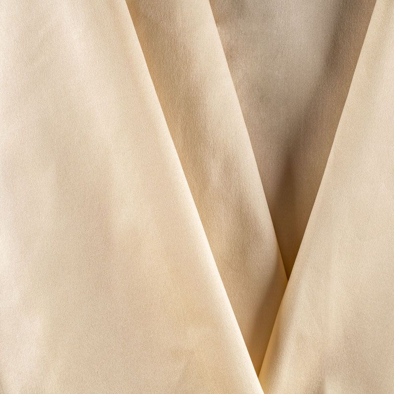 Шелковистая тафта сливочного оттенка. Поверность матовая, с благородным шелковым лоском. Полотно средней плотности, легкое, отлично держит форму, драпируется жесткими складками. Хорошо смотрится в платьях с пышными юбками и крупными драпировками, костюмах, корсетах для платья, вечерних и коктельных платьях.