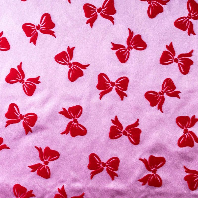 Шелковая тафта цвета фуксии с романтичными банктиками вишневого цвета. Ткань тонкая, но плотная, отлично держит форму, драпируется красивыми жесткими складками и загибами. Фактура гладкая, с матовым блеском. На ощупь приятная, слегка шуршащая. Идеальна для пошива нарядных пышных платьев и юбок, вечерних костюмов, плащей и легких пальто.