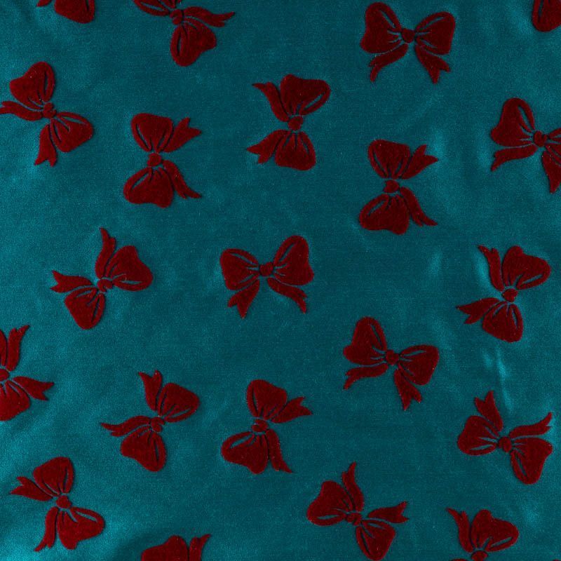 Шелковая тафта насыщенного цвета тиффани с романтичными банктиками вишневого цвета. Ткань тонкая, но плотная, отлично держит форму, драпируется красивыми жесткими складками и загибами. Фактура гладкая, с матовым блеском. На ощупь приятная, слегка шуршащая. Идеальна для пошива нарядных пышных платьев и юбо, вечерних костюмов, плащей и легких пальто.