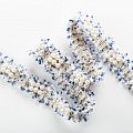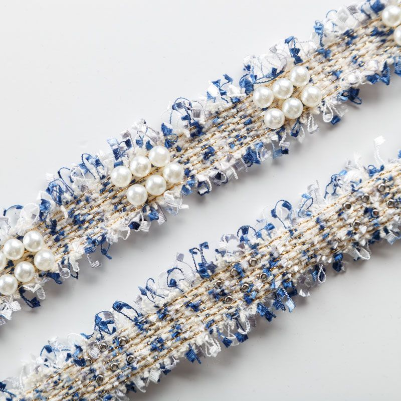 Тесьма декоративная выполнена из бархатистых нитей, прошита люрексом и украшена жемчужными бусинами. Бусины надежно закреплены на тесьме. Подойдет для отделки одежды из твида, букле в стиле Шанель.