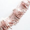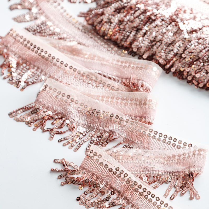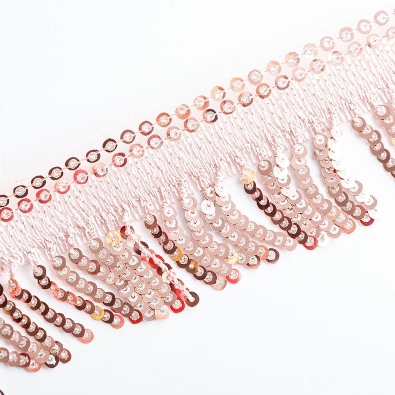 Тесьма выполнена в виде бахромы с мелкими пайетками. Можно использовать для отделки платьев, рубашек, манжет, вечерней и свадебной одежды, верхней одежды, обуви, сумок, украшений, предметов интерьера, а также для сценических костюмов.