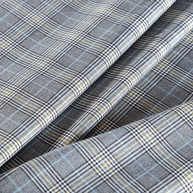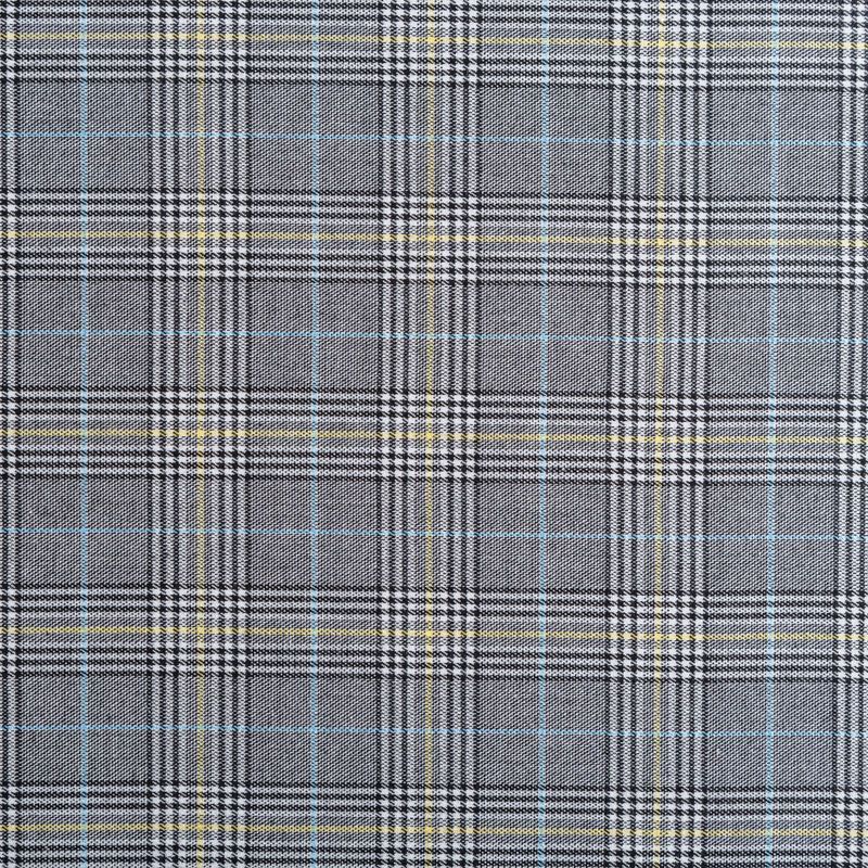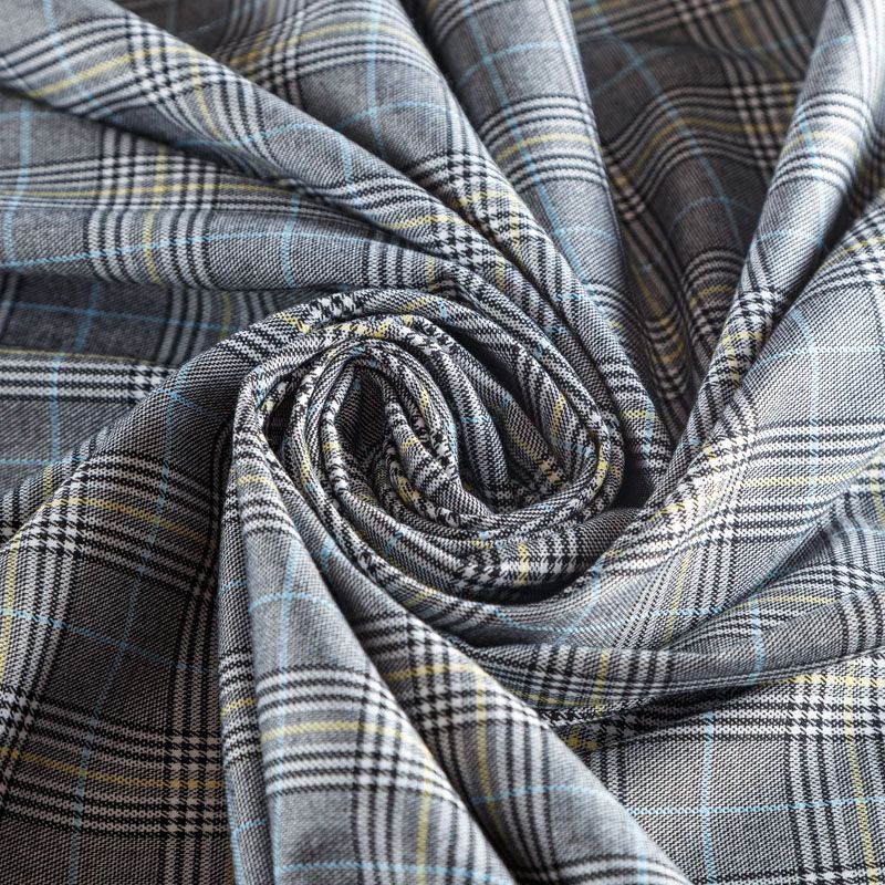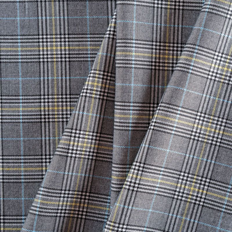 Ткань средней плотности, легкая и мягкая, приятная на ощупь, немного эластичная, хорошо драпируется и образует мягкие складки. Сочетание линий серого, белого, черного оттенков и принта "гусиная лапа" образует сложную красивую клетку. Монохромный строгий принт разбавляет еле уловимая элегантная тонкая полоска голубого и желтого цветов. Ткань отлично подойдет на костюмы, юбки, брюки, платья, жакеты.
