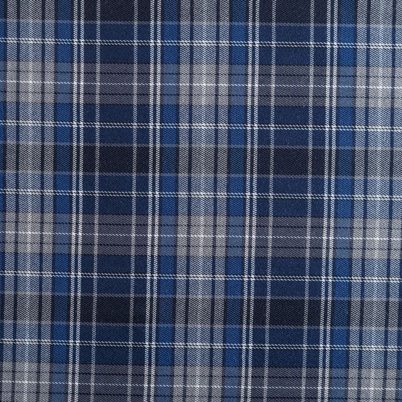 Костюмно-плательная ткань средней плотности в серо-синей гамме. Сочетание линий синего, черного, молочного и серого цветов образуют красивую сложную клетку. Ткань не сухая, пластичная, приятная на ощупь, тянется за счет эластана в составе, формоустойчива, хорошо драпируется. Отлично подойдет для пошива костюмов, юбки, брюк, платья, жакета, сарафана, шорт.