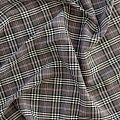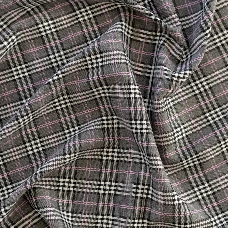 Ткань средней плотности, мягкая и приятная на ощупь, немного тянется, формоустойчива, хорошо драпируется и образует мягкие складки. Сочетание линий черного, белого и розового цветов на спокойном сером фоне образует сложную красивую клетку тартан. Ткань отлично подойдет на костюмы, юбки, брюки, платья, жакеты.