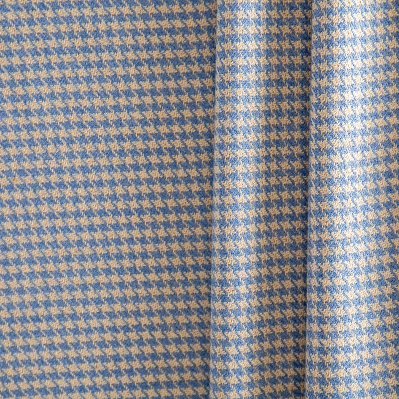 Костюмная ткань с уже классическим узором пье-де-пуль (гусиная лапка) песочно-голубого цвета. Рисунок образован за счёт жаккардового переплетения нитей. Материал мягкий, плотный, благодаря эластану изделия идеально сядут по фигуре и будут очень комфортные. Рекомендуем для пошива костюма, жакета, шорт или юбки.