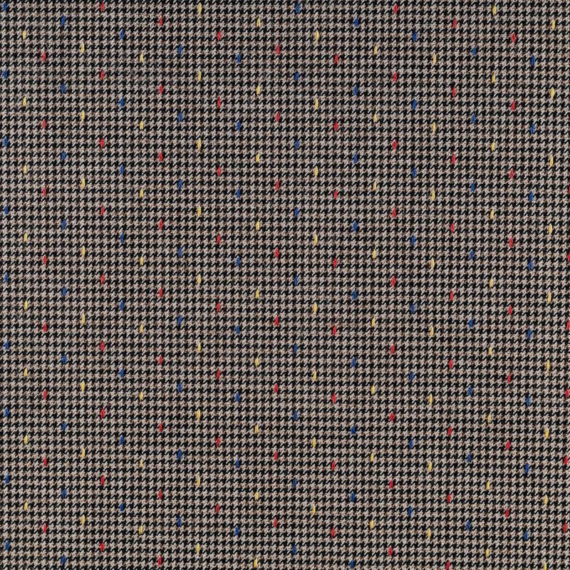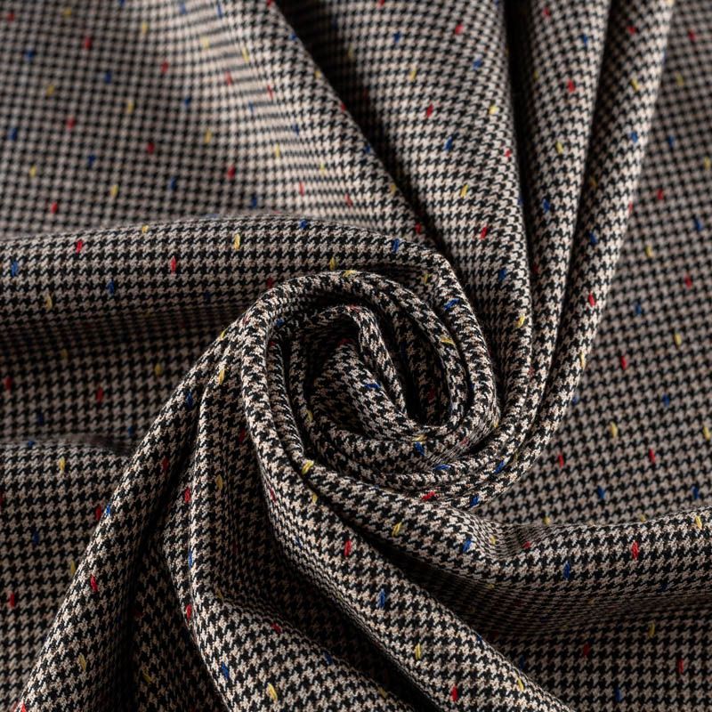 Костюмная ткань средней плотности с добавлением вискозы. Мягкая и слегка рельефная, с мелким геометрическим принтом - гусиная лапка, дополненным цветными точками. Полотно очень приятное на ощупь, не мнется, не сухая, пластичная, отлично драпируется. Идеально подойдет для костюма, жакета или жилета, брюк, а также юбок и платьев.