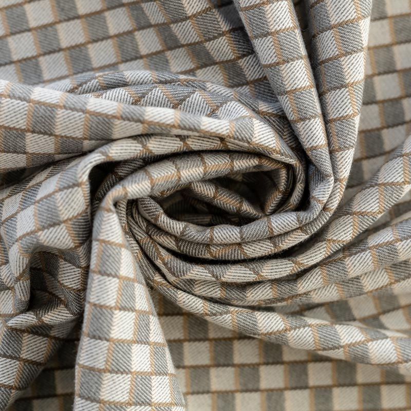 Плотная костюмно-плательная ткань, немного суховатая, но приятная на ощупь, тянется за счет эластана, формоустойчива, не мнется, хорошо драпируется. Мелкая клетка образована за счет расположенных в шахматном порядке квадратиков серого цвета в разных оттенках. Ткань отлично подойдет на костюмы, юбки, брюки, платья, жакеты, кардиганы.