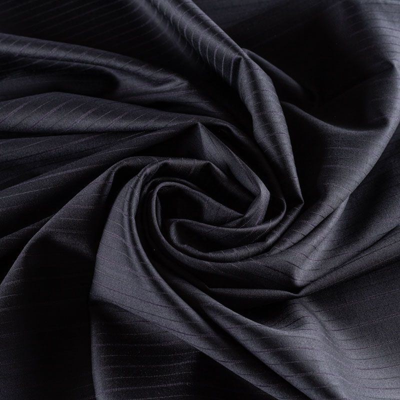 Костюмно-плательная ткань средней плотности, немного суховата, приятная на ощупь. На графитовом фоне очень тонкая полоска сиреневого оттенка, направление - вдоль кромки. Прекрасно подойдет для пошива брюк-палацио, жакета, платья по фигуре, сарафана, классического мужского или женского костюма.