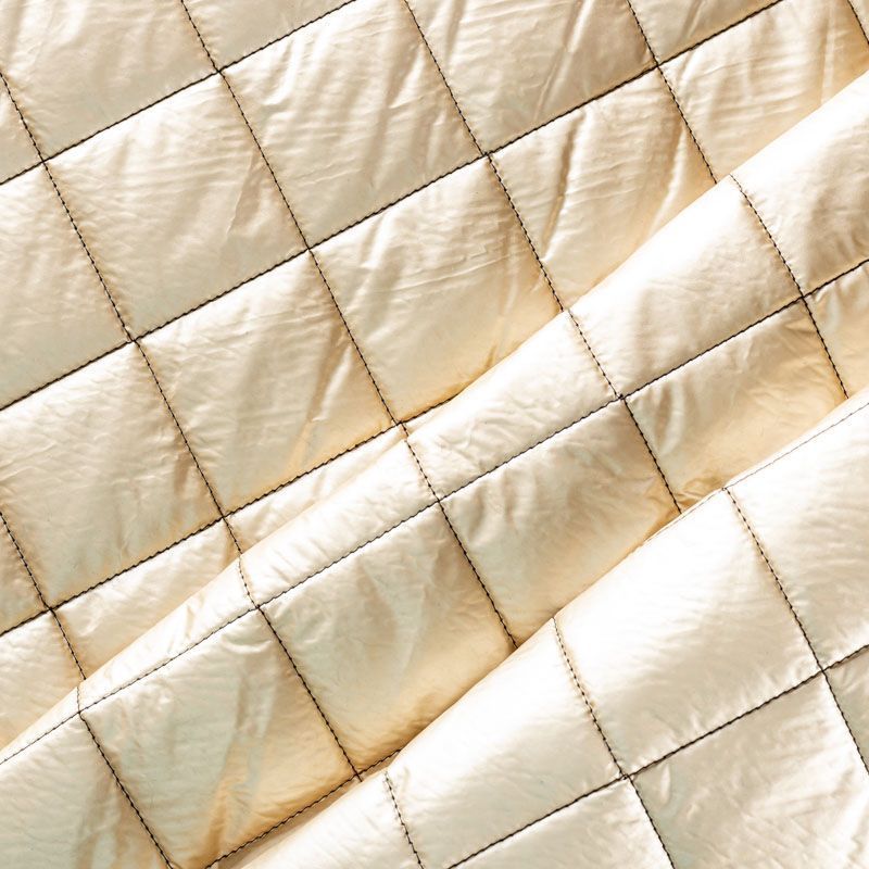 Трехслойная итальянская курточная ткань золотисто-бежевого оттенка с легким эффектом металлик, простеганная не крупными ромбами размером 3х3 см. Нижний, черного цвета, заменяет подклад и верхний слой - полиэстер, по качеству напоминает болонь, между ними синтепон. Ткань легкая, пластичная, хорошо драпируется. Прекрасно подойдет для пошива легких пальто, курток, бомберов, жилетов, накидок-кейпов, объемных сумок, одежды для домашних питомцев, туристического снаряжения.